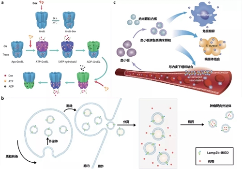 (b) 以外泌體為代表的胞外囊泡納米機(jī)器用于藥物遞送;