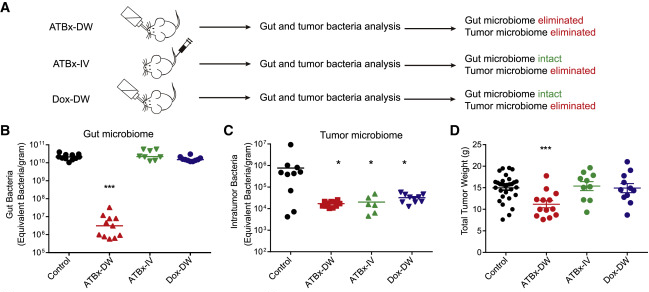 清除腫瘤內(nèi)的微生物會阻礙腫瘤的轉(zhuǎn)移,但不會阻礙原發(fā)腫瘤的生長通過測試不同的抗生素組合和給藥途徑來選擇性地消除腫瘤駐留或腸道微生物群(圖3A)。研究發(fā)現(xiàn)使用雞尾酒抗生素(ATBx),通過飲用水(DW)可以有效清除腸道和腫瘤微生物菌群。當(dāng)ATBx經(jīng)尾靜脈靜脈注射時,腫瘤菌群被清除,而腸道菌群保持完整(圖3B和3C)。通過DW給藥穿透細(xì)胞膜的抗生素多西環(huán)素具有與ATBx-IV相似的效果(圖3B和3C)。最重要的是,ATBx-IV和Dox-DW處理在腸道活菌數(shù)量、腸道微生物群譜和腫瘤免疫譜方面與對照組保持相當(dāng)(圖S3A S3D和S3F S3I)。結(jié)果發(fā)現(xiàn)ATBx-DW能有效地減緩自發(fā)MMTV-PyMT BTs的腫瘤生長(總腫瘤重量為15±對照組為0.5g,而ATBx-DW為11±0.8g),而單獨用ATBx-IV或Dox-DW消除腫瘤微生物群并不影響腫瘤總重量(圖3D)。這表明腸道菌群在腫瘤生長中起著重要作用,而腫瘤菌群則不然。